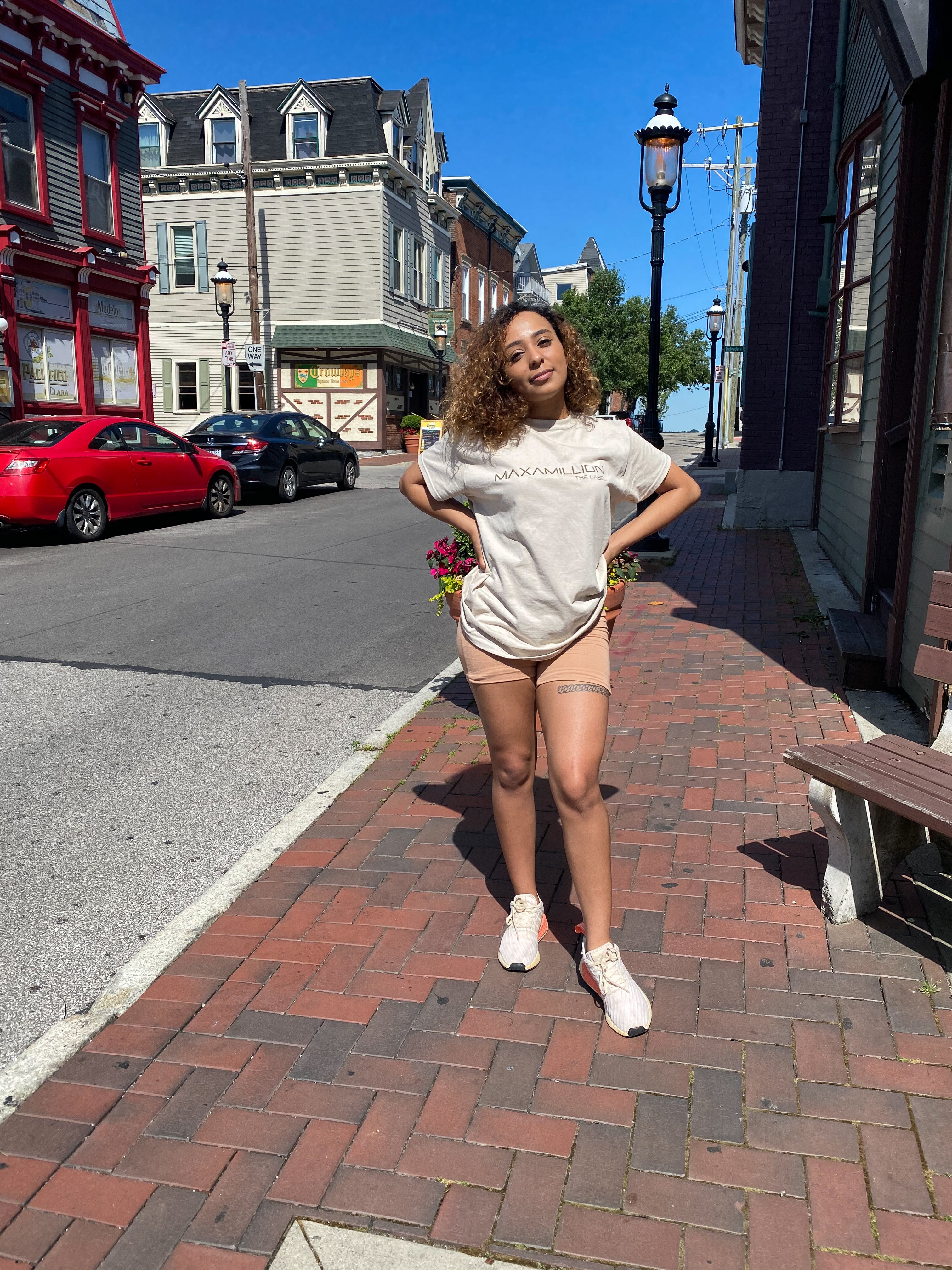 Stay comfy in stye in the Original Short Sleeve Shirt in the color Sand with Brown lettering.